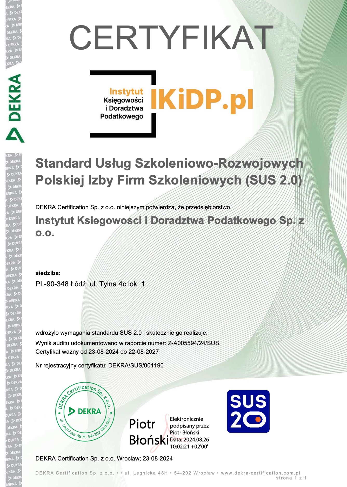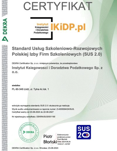 Instytut Księgowości i Doradztwa Podatkowego sp. z o.o. uzyskał certyfikat zgodny ze Standardem Usług Szkoleniowo-Rozwojowych SUS 2.0 przyznany przez DEKRA Certification Sp. z o.o. To formalne potwierdzenie, że nasze działania w obszarze szkoleń i rozwoju spełniają najwyższe standardy jakości wyznaczone przez Polską Izbę Firm Szkoleniowych.